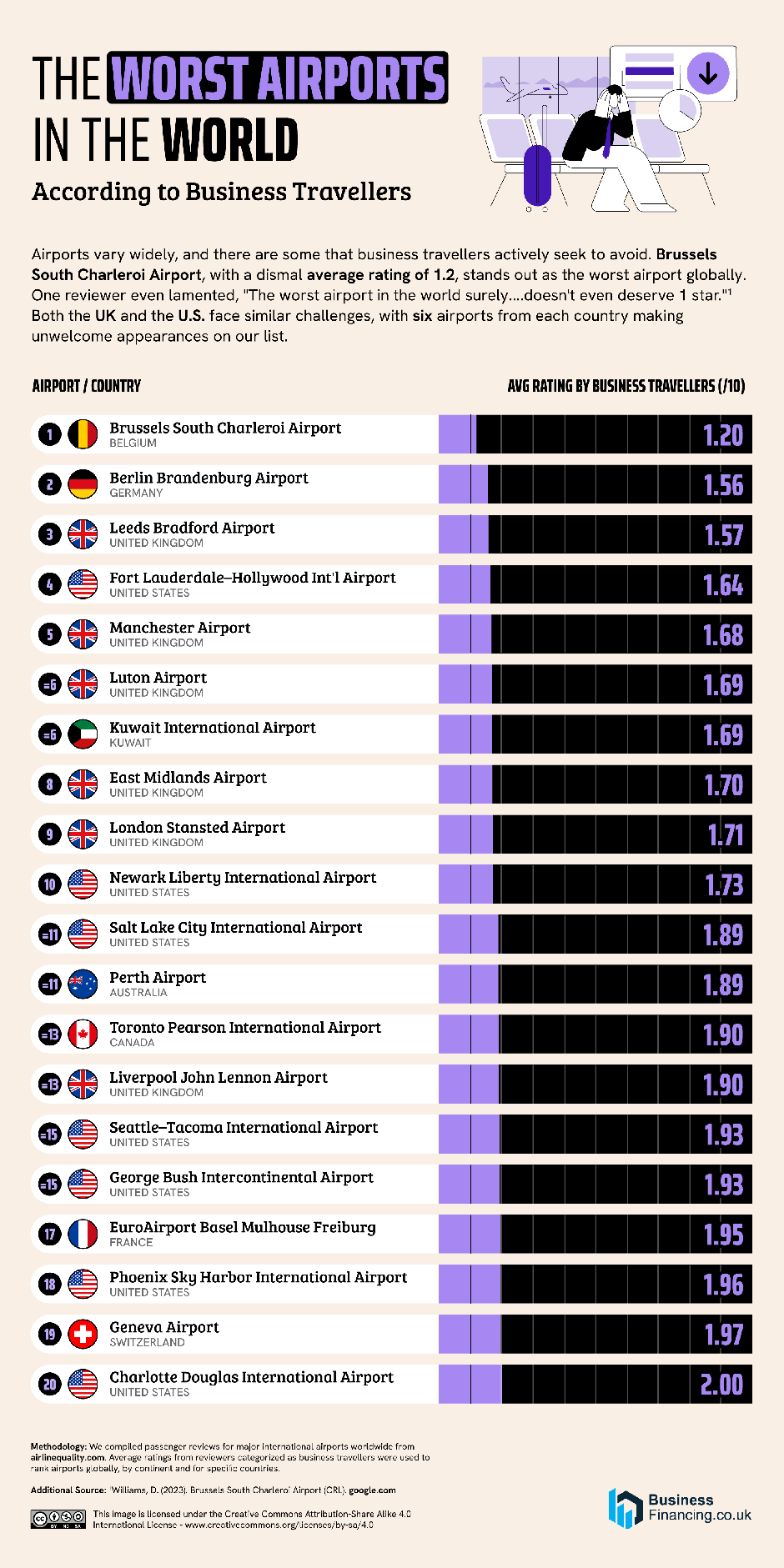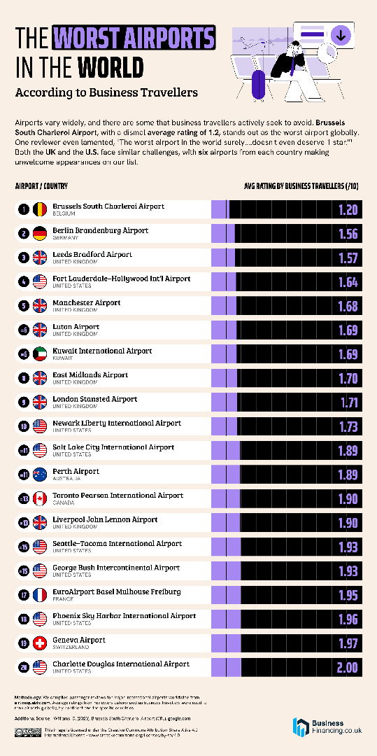 Business financing je rangirao 20 najgorih međunarodnih zračnih luka za putnike, a pola ih je u Europi, uključujući šest u Velikoj Britaniji.