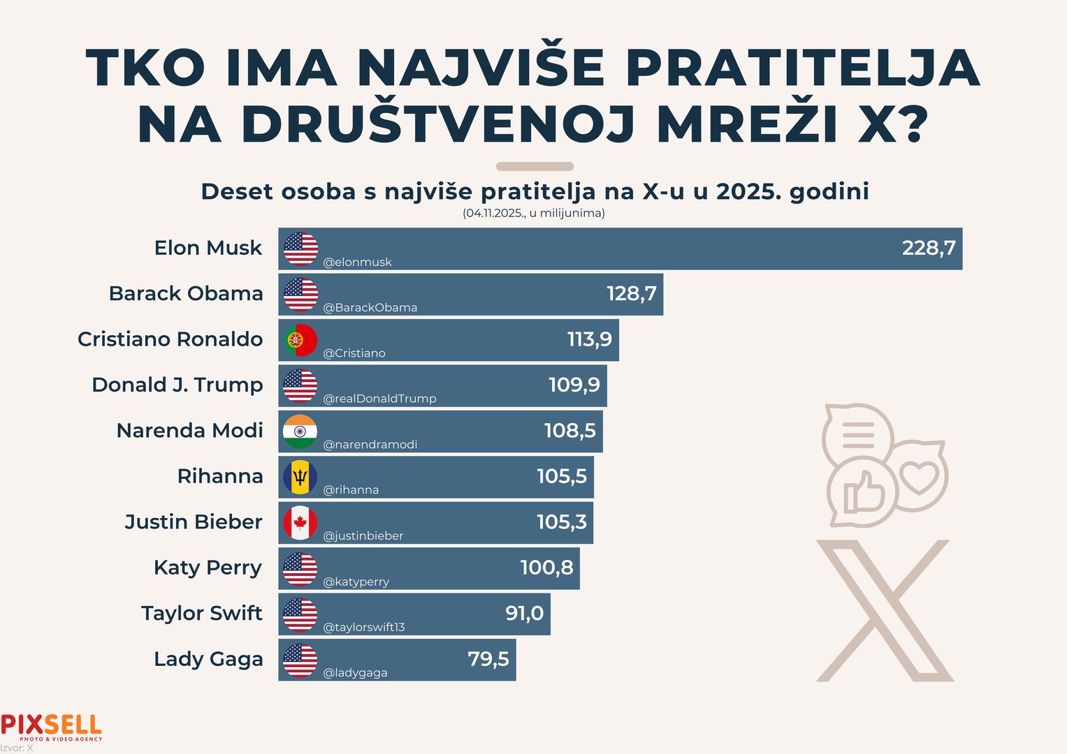 Prema podacima iz studenoga 2025. godine, najpraćenija osoba na društvenoj mreži X (bivši Twitter) je Elon Musk, koji ima impresivnih 228,7 milijuna pratitelja. Na drugom mjestu nalazi se Barack Obama sa 128,7 milijuna, dok treće mjesto zauzima Cristiano Ronaldo sa 113,9 milijuna pratitelja.