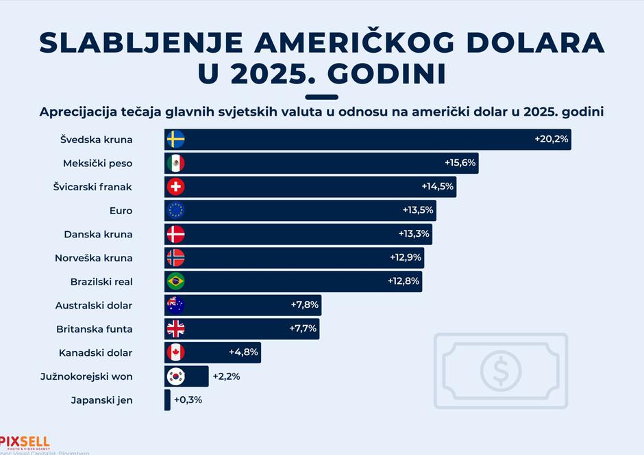 Glavne svjetske valute ojačale su u odnosu na američki dolar tijekom 2025. godine, pri čemu švedska kruna vodi s porastom od 20,2%, slijedi meksički peso s 15,6% te švicarski franak s 14,5%. Slijede euro, danska i norveška kruna te brazilski real - svi s dvoznamenkastim postotkom aprecijacije, dok su na dnu ljestvice australski i kanadski dolar, britanska funta, južnokorejski won te japanski jen s najmanjim rastom od samo 0,3%.