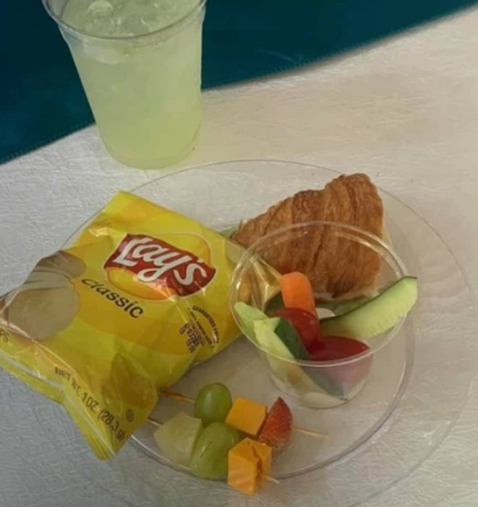 "Ovo smo dobili za glavno jelo - čips, malo sirovog povrća, malo voća na štapićima i pola kroasana. Osim toga, cijela sala je izgledala neuredno. Strašno.", napisala je.