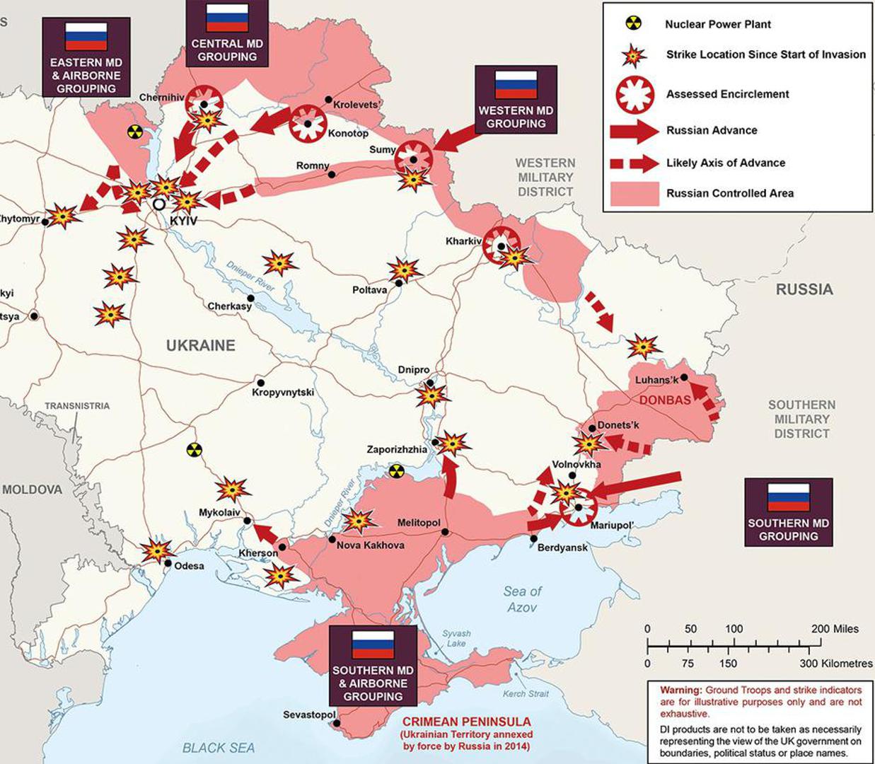 Mjesta koja se od početka invazije nalaze na udaru označena su simbolom koji nalikuje eksploziji. Njih je najviše u okolici Kijeva, glavnog grada, prema kojemu je usmjereno i više isprekidanih strelica, odnosno daljnjih vjerojatnih puteva kretanja ruskih trupa.