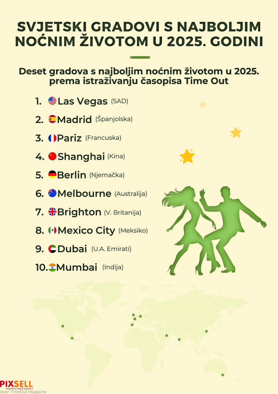 Prema istraživanju časopisa "Time Out", Las Vegas je proglašen svjetskim gradom s najboljim noćnim životom u 2025. godini. Američka prijestolnica zabave opravdala je svoj status destinacije koja nikada ne spava, dok se na drugom mjestu našao Madrid. Treću poziciju zauzeo je Pariz.