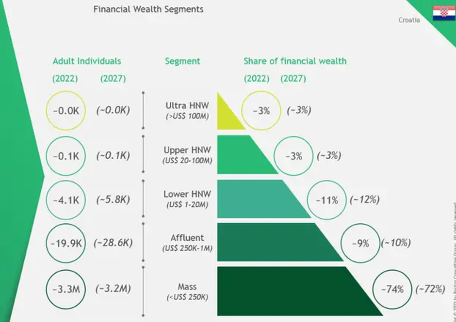 U Republici Hrvatskoj postoji približno tisuću ljudi koji imaju osobno financijsko bogatstvo* veće od 20 milijuna dolara, dok osobno financijsko bogatstvo velike većine stanovništva (3,3 milijuna građana) ne doseže 250 tisuća dolara, otkriva Globalno izvješće o bogatstvu (eng. Global Wealth Report 2023) koje je objavio Boston Consulting Group.