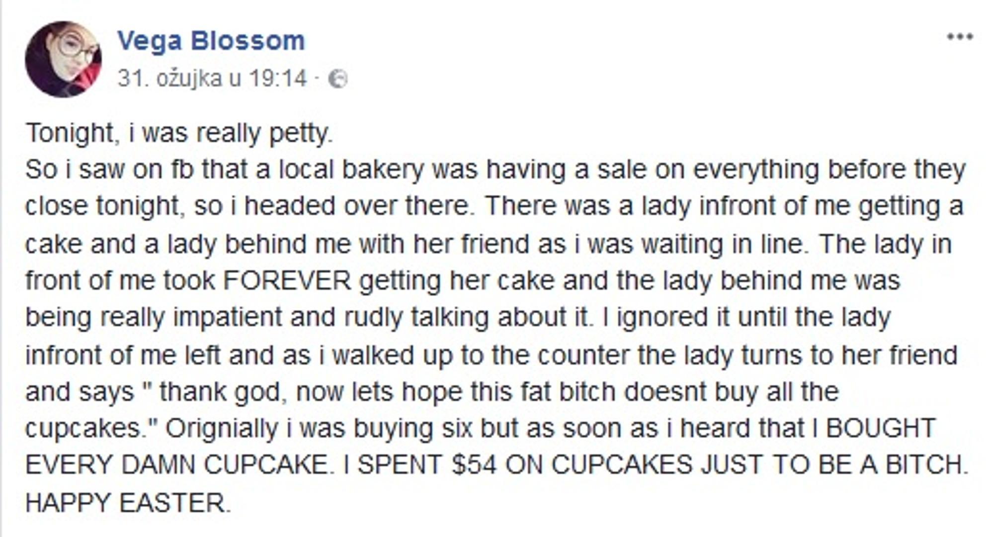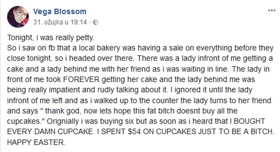 Koliko ljudi mogu biti okrutni uvjerila se djevojka po imenu Vega Blossom (19) dok je stajala u redu u omiljenoj pekari u gradu Valparaiso u američkoj saveznoj državi Indiani.