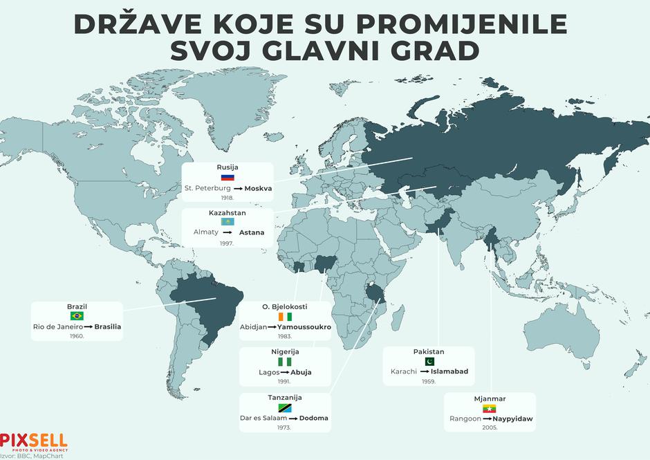 Znate li da je nekoliko država u svijetu promjenilo svoj glavni grad. Infografika Pixsella prikazuje koje su to države promijenile svoj glavni grad. Kako se može vidjeti ukupno je osam država to uradilo: Rusija, Kazahstan, Brazil, O. Bjelokosti, Nigerija, Tanzanija, Pakistan i Mjanmar.