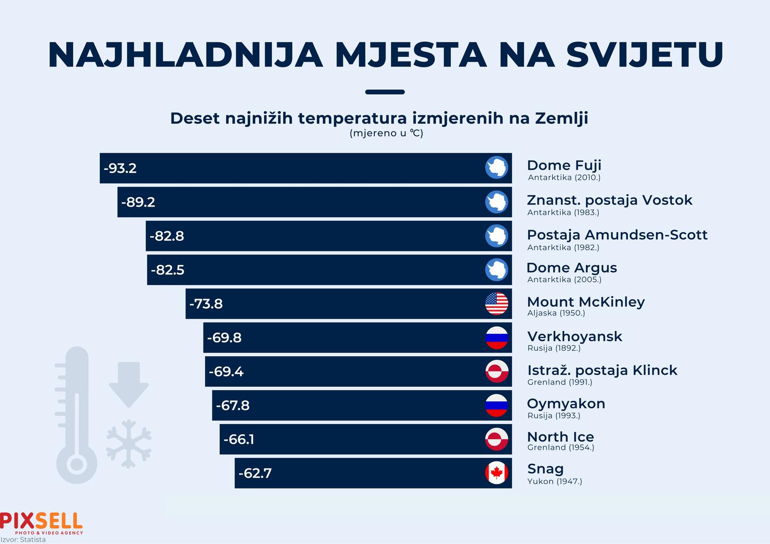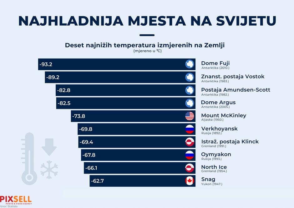Pixsell donosi infografiku koja prikazuje deset najnižih temperatura izmjerenih na Zemlji, mjerenih u stupnjevima celzijusa