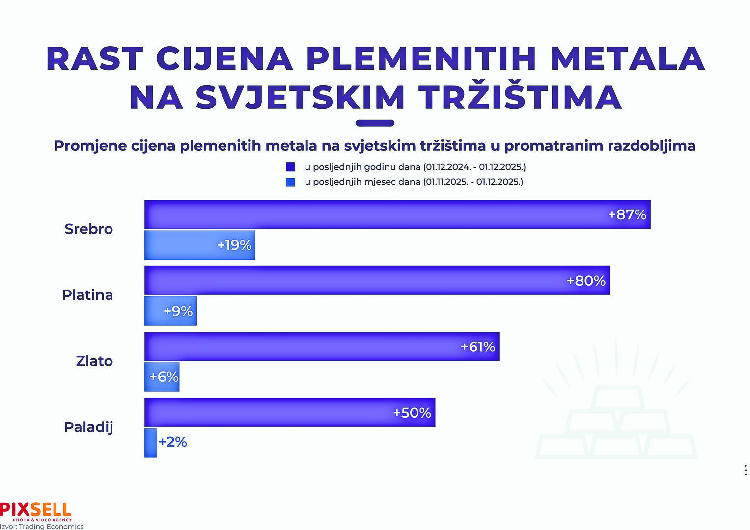 Prema izvoru Trading Economicsa, cijene plemenitih metala na svjetskim tržištima tijekom jedne godine drastično su porasle. Cijena srebra uvećana je za 87 posto, platina je porasla 80 posto, zlato 61 posto te paladij 50 posto. Također, u infografici je prikazan i rast pojedinih metala na mjesečnoj razini.