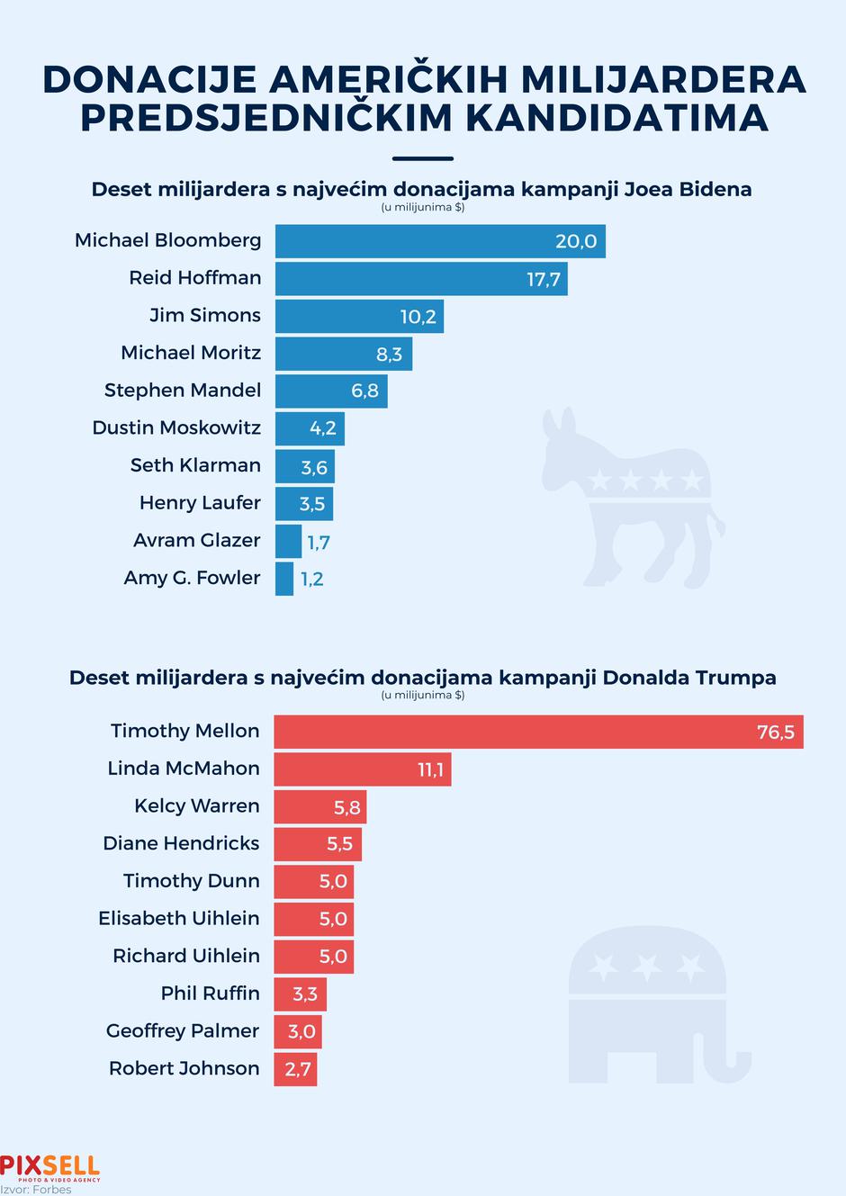 Najveći donator u kampanji Donalda Trumpa je Timothy Mellon s čak 76,5 milijuna dolara, a Joea Bidena Michael Bloomberg s 20 milijuna i Reid Hoffman sa 17,7 milijuna dolara