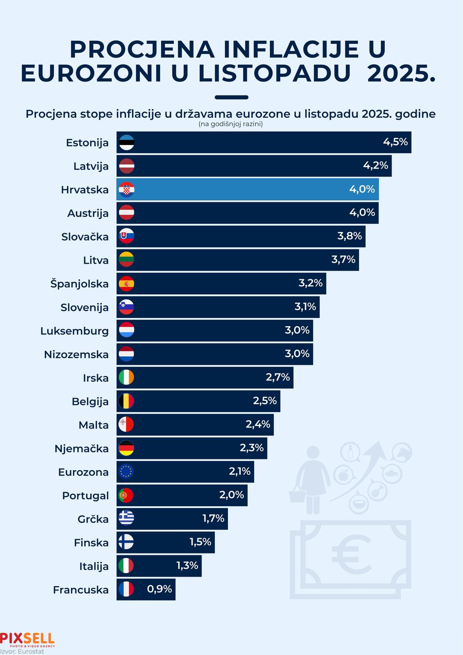 Na vrhu ljestvice s najvišom očekivanom inflacijom nalazi se Estonija s čak 4,5 posto, slijedi Latvija s 4,2 posto, dok se Hrvatska i Austrija nalaze na trećem mjestu s po 4 posto. Iza njih slijede Slovačka s 3,8 posto, Litva s 3,7 posto te Španjolska i Slovenija s nešto umjerenijim stopama od 3,2 i 3,1 posto.