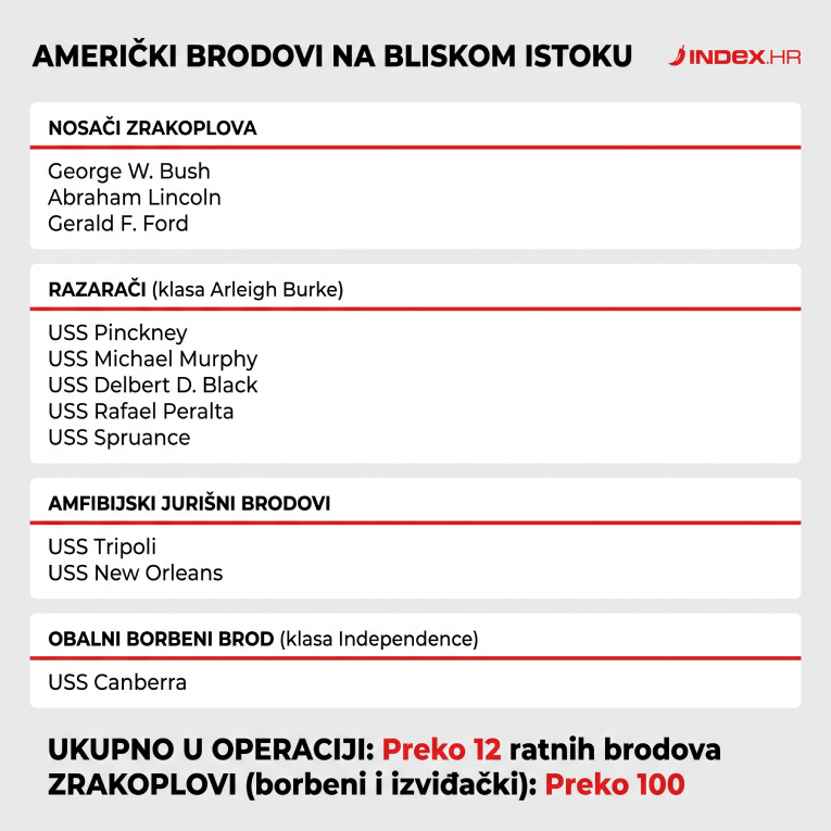 Iako nije precizirana konkretna zadaća nosača, poznato je da značajne pomorske snage SAD-a već sudjeluju u blokadi pristupa iranskim lukama u blizini Hormuškog tjesnaca. Index.hr donosi pregled dijela vojnih sredstava koja su već angažirana u toj operaciji, piše Sky News.
