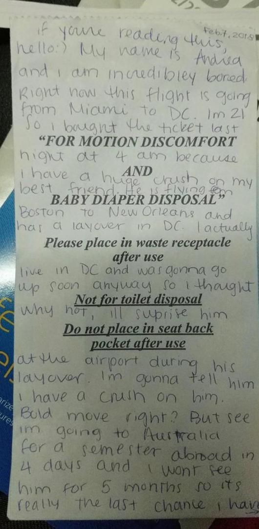 Bila je toliko uzbuđena da je nekome morala reći gdje i zašto putuje pa je svoje osjećaje prenijela na papir i ostavila napisano pismo u zrakoplovu, a koje je pronašao netko od osoblja i objavio gotovo godinu dana kasnije na Redditu.