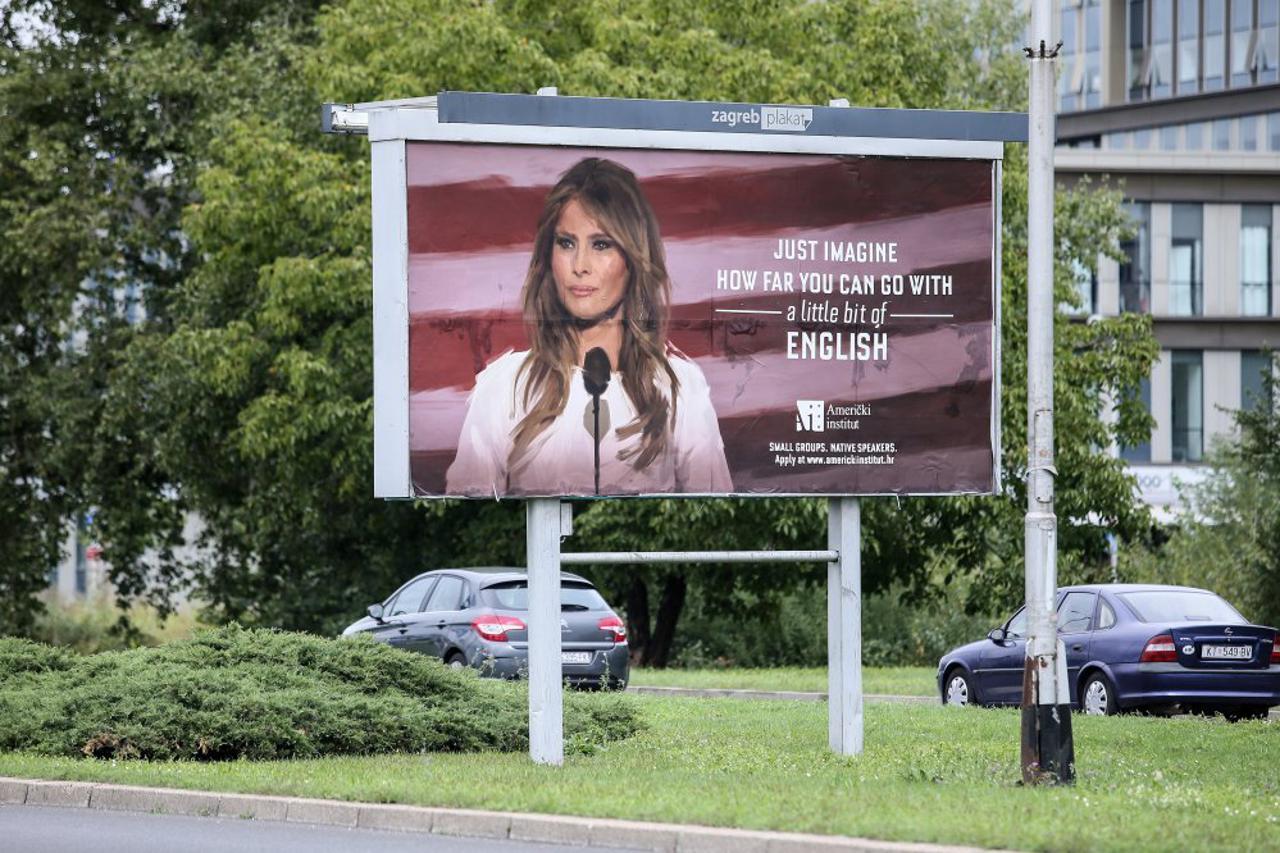 'Zamislite koliko daleko možete dospjeti uz malo engleskog' uz fotografiju Melanije Trump. Provokativna je to reklama iza koje stoji američki institut, udruga za promicanje engleskog jezika i američke kulture. Kako doznaje RTL, gospođa Trump poprilično negoduje, i osim što slijedi tužba - zatraženo je da se plakati - uklone - i to u sljedeća 24 sata.