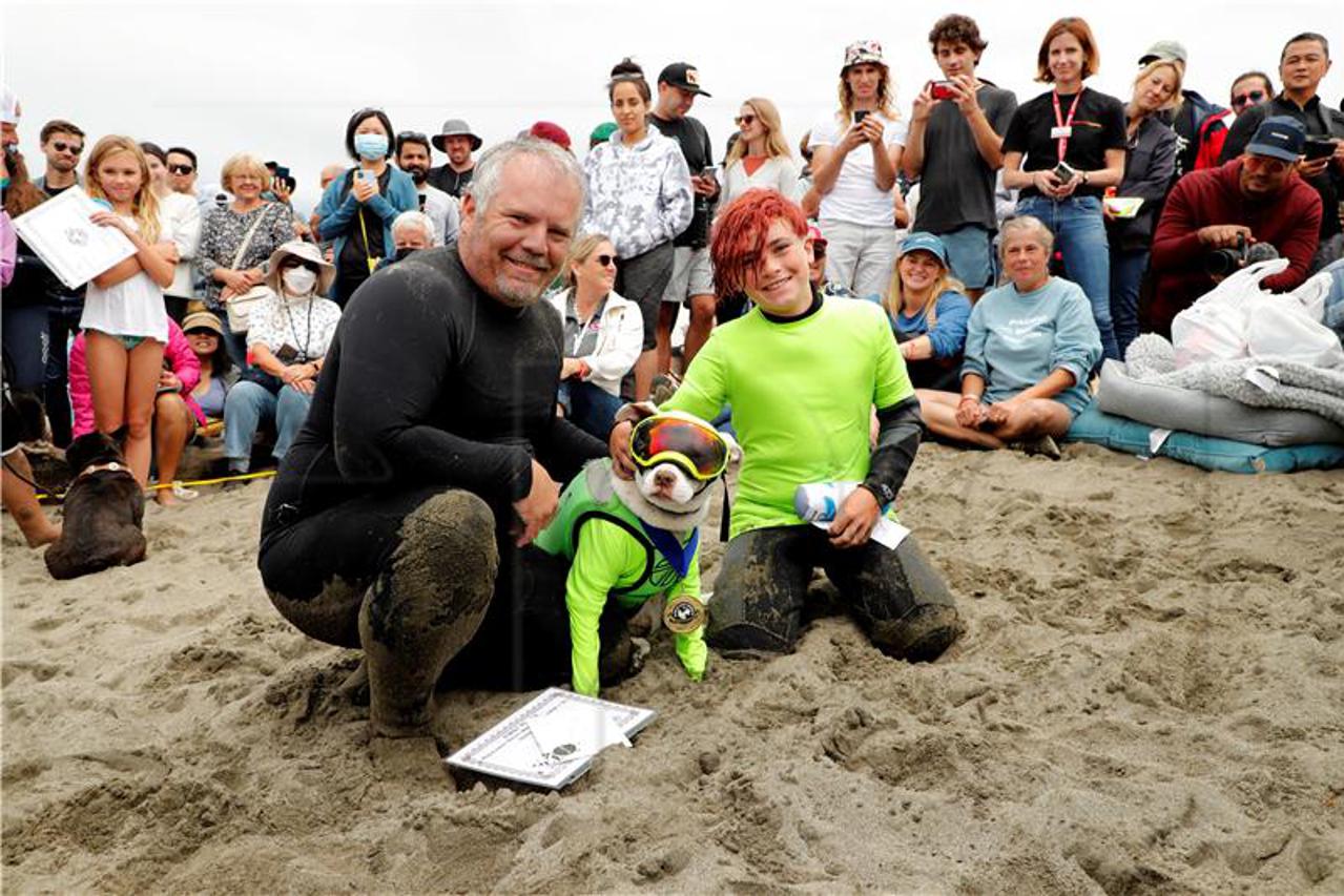 Psi u Kaliforniji vježbaju tehnike jahanja na valovima uoči Svjetskog natjecanja u surfanju pasa koje će se održati 8. rujna i zajedno s vlasnicima isprobavaju mekane daske za surfanje i specijalizirane uređaje za plutanje.