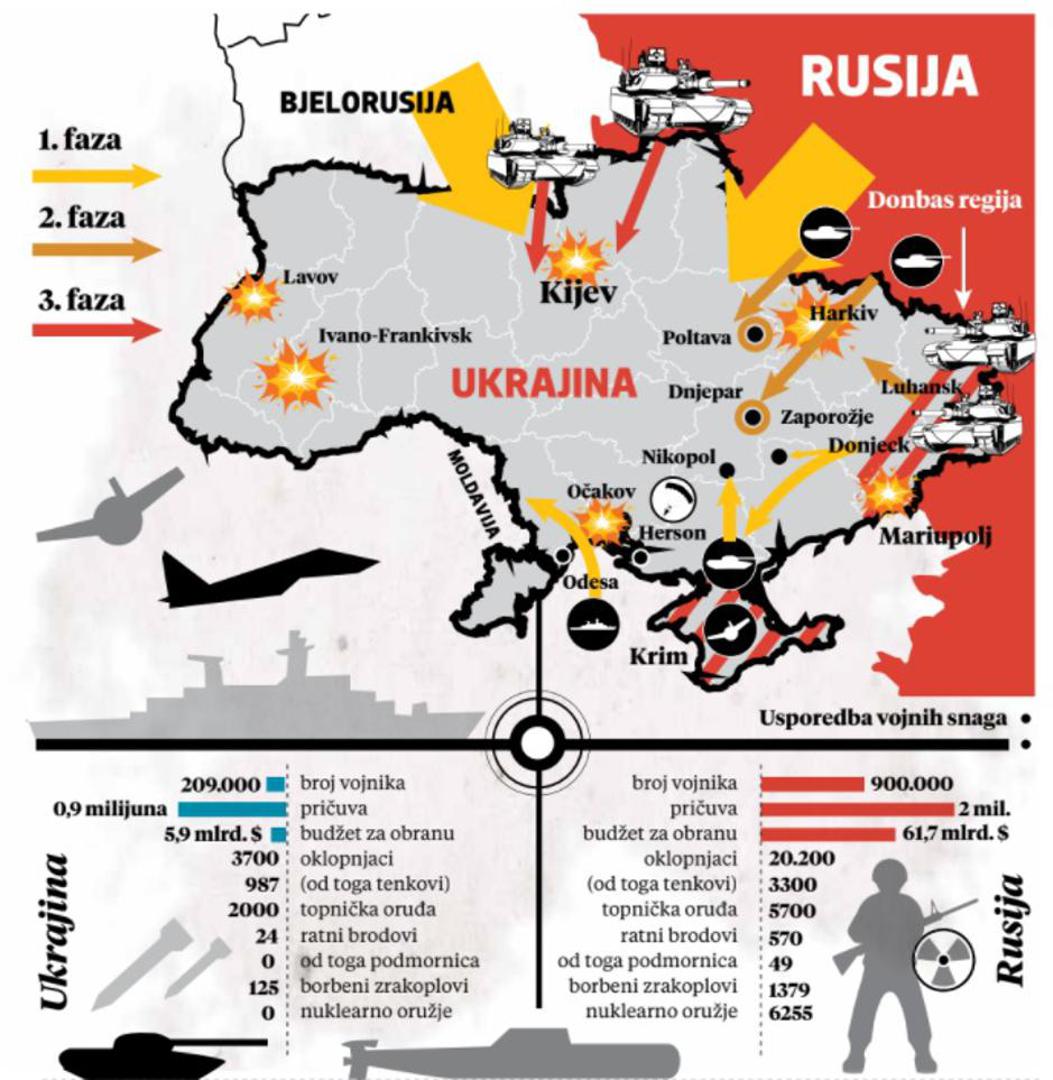 Svijet se jučer promijenio! Rusija je rano ujutro pokrenula opću invaziju na Ukrajinu nakon višemjesečne pripreme, koristeći cijeli arsenal: zračne, kopnene i pomorske snage. Napala je iz više smjerova: sa sjevera iz svoje saveznice Bjelorusije, s istoka te s Krima na jugu. Koristi topništvo i udare borbenih zrakoplova. Najveća je to kopnena invazija u Europi nakon Drugog svjetskog rata, čime je premašila hrvatsku oslobodilačku akciju Oluja koja je dosad imala taj status. No, dok je Oluja rat u Hrvatskoj završila, ruska invazija rat je započela.
