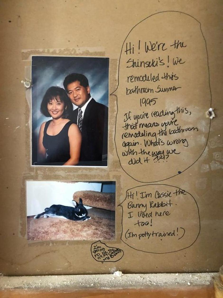 – Pozdrav! Mi smo Shinsekiji. Renovirali smo kupaonicu u ljeto 1995. Ako ovo čitate, to znači da ponovno renovirate kupaonicu. Što smo mi krivo napravili? – stoji u poruci uz fotografiju bračnog para koji je prije živio u kući.
