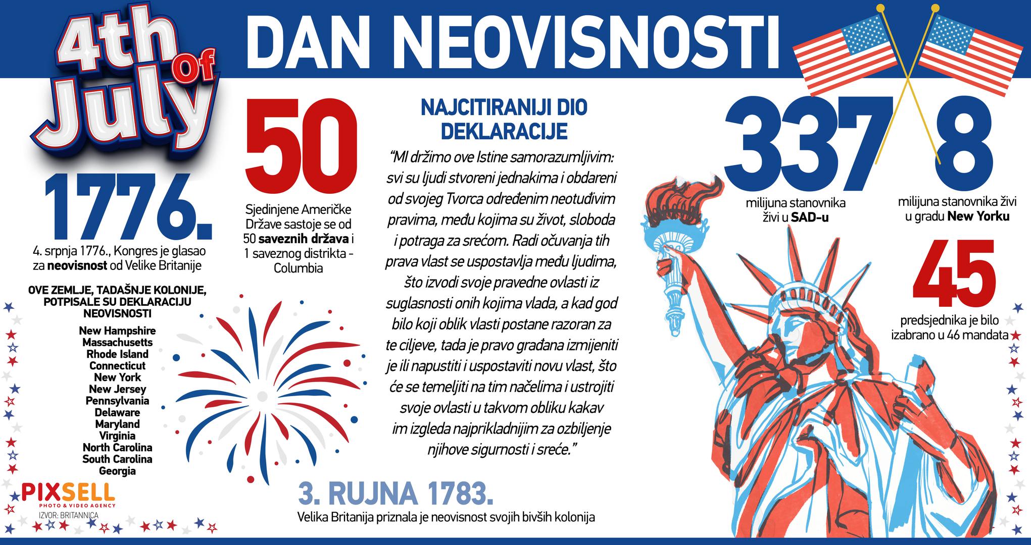 Infografika prikazuje sve o prazniku Četvrti srpnja (na engleskom Fourth of July), koji je drzavni praznik kojim se slavi donosenje Americke deklaracije o neovisnosti 4. srpnja 1776. godine, kojom je proglasena nezavisnost od Velike Britanije.