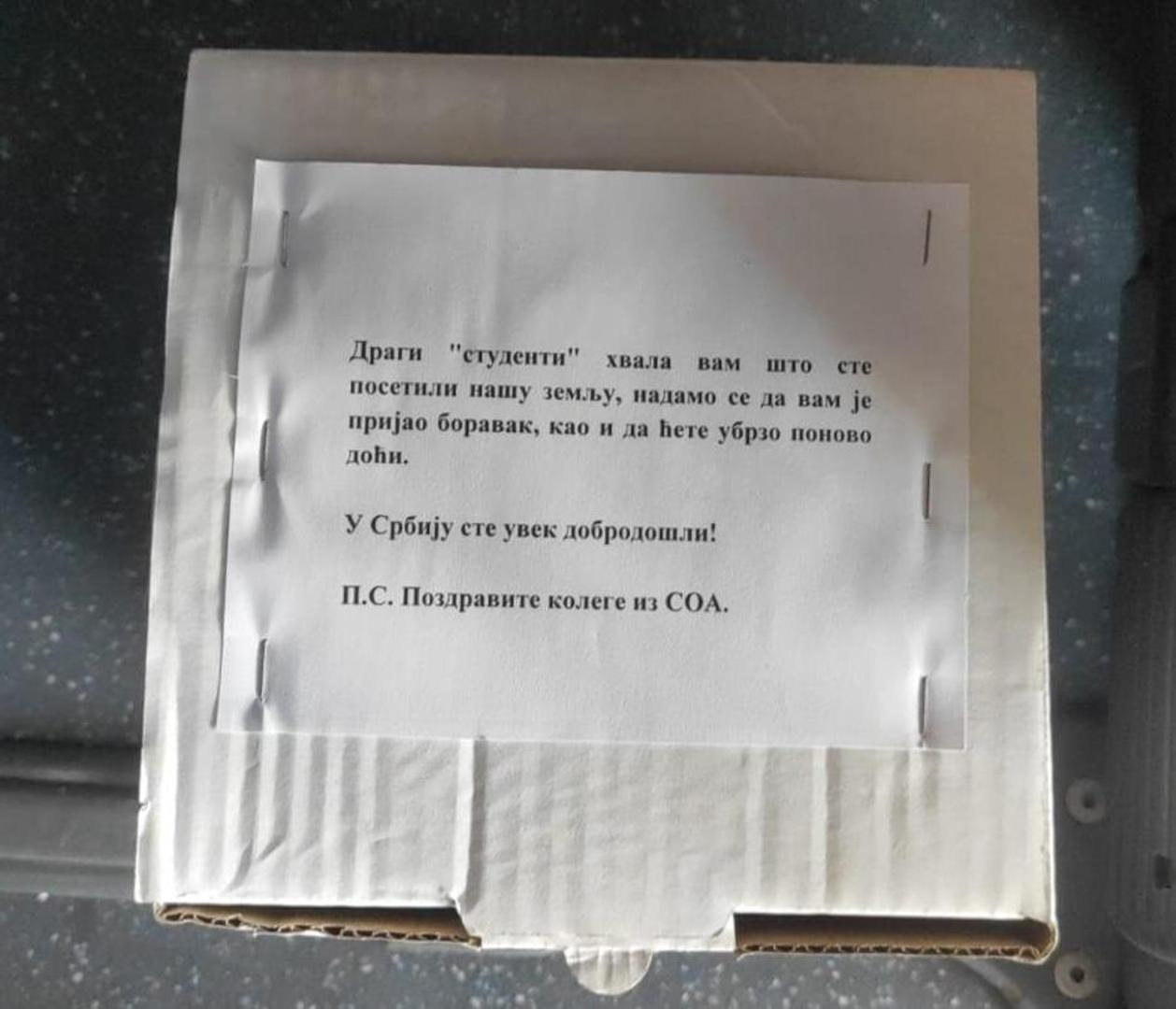 Hrvatski studenti koje je srbijanski tabloid prozvao da su hrvatski špijuni i da su u Beogradu na specijalnom zadatku i da im je cilj destabilizacija Srbije i rušenje njezina predsjednika Aleksandra Vučića, danas su prešli granicu i vratili se u Hrvatsku. Na granici su dobili "dar" od Srba - kutiju s 50-ak bočica rakije, na kojoj je natpis: "Dragi 'studenti', nadamo se da ste se dobro proveli i dođite nam opet. P. S. Pozdravite kolege u SOA-i."