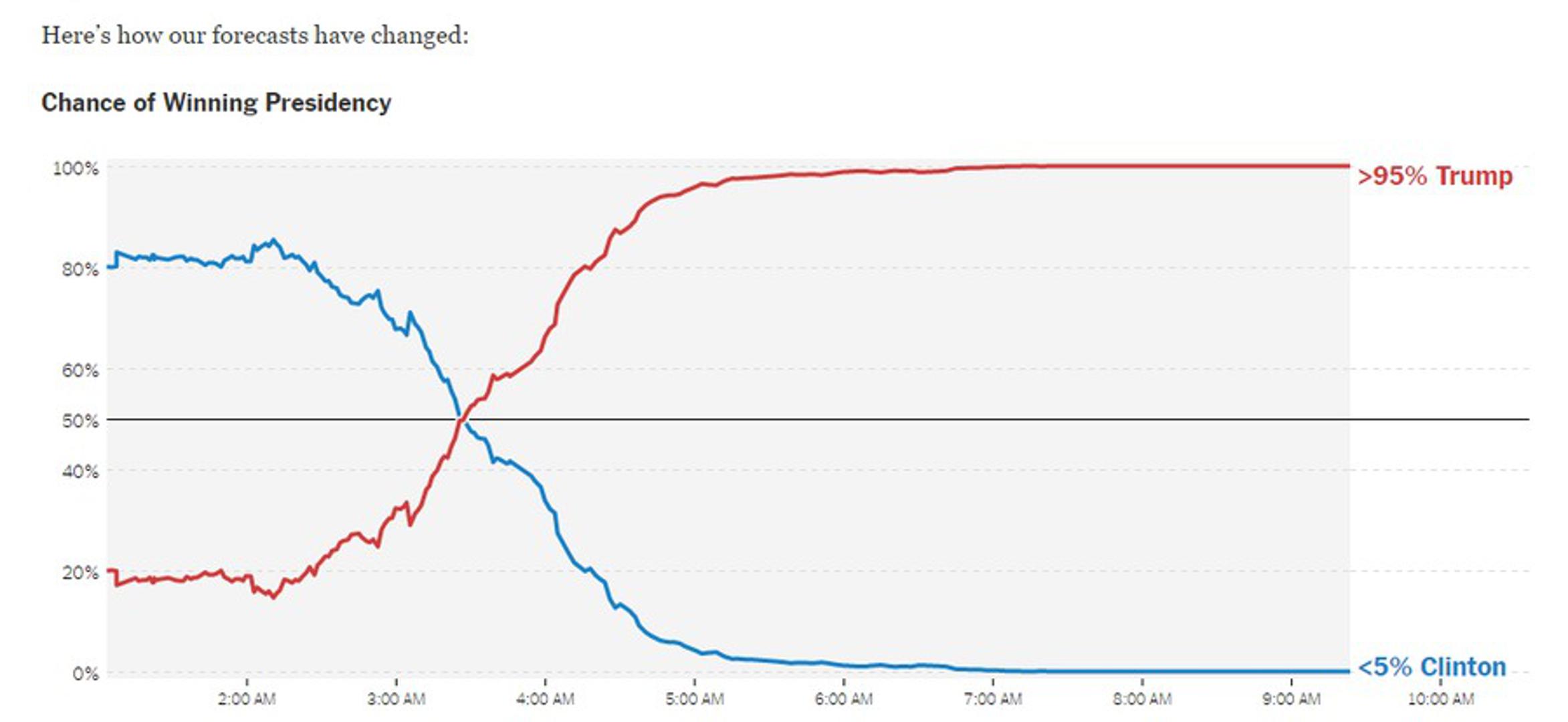 Prema grafu koji je objavio New York Times vidi se da su se na samom početku kada su počeli pristizati prvi rezultati velike šanse davale Hillary Clinton. No, sve se počelo mijenjati nešto iz 3 sata kada je Donald Trump osvojio Floridu, Sjevernu Karolinu i Ohio.