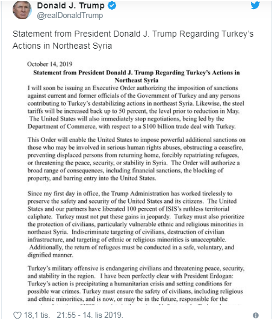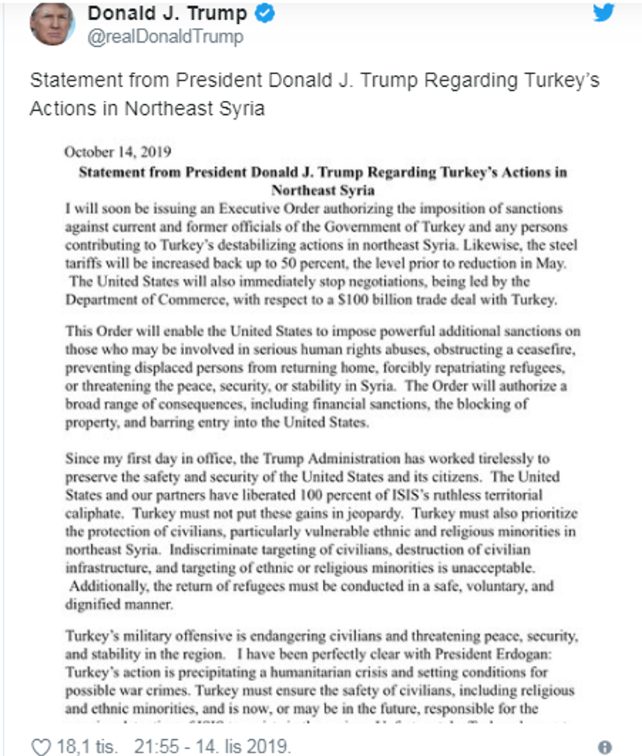 - Turske akcije ubrzavaju humanitarnu krizu i postavljaju uvjete za potencijalne ratne zločine - izjavio je Trump u ponedjeljak, najavljujući nadolazeće mjere protiv Ankare.