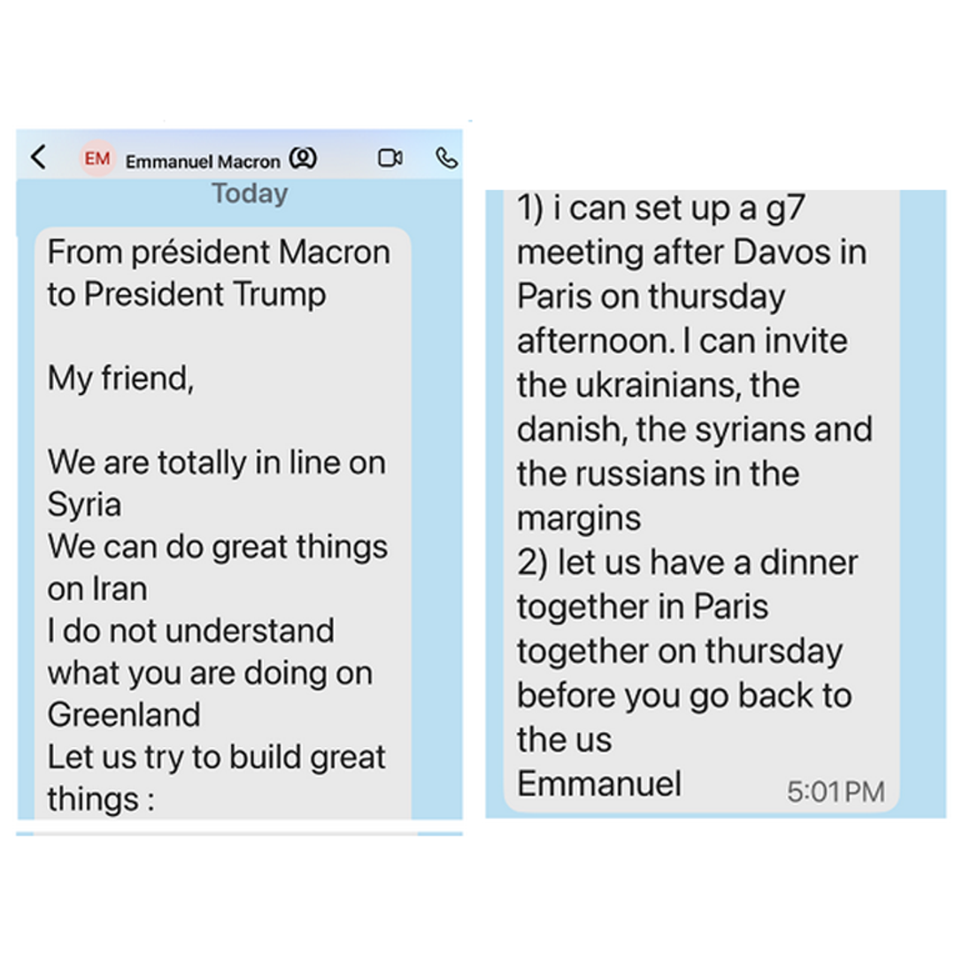Posljednjih dana Macron je Trumpovu prijetnju carinama zbog Grenlanda nazvao "neprihvatljivom". Također je odbio Trumpov poziv da se pridruži "Odboru mira" koji bi nadgledao obnovu Gaze. Na pitanje o tome da je Macron odbio poziv kasno u ponedjeljak, Trump je rekao: "Nitko ga ne želi", te spomenuo mogućnost uvođenja carina od 200 posto na francusko vino i šampanjac.