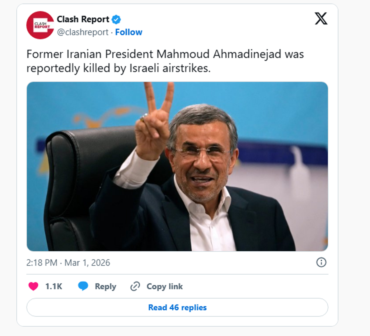 Pojavila su se tako i brojna izvješća o atentatu na bivšeg iranskog predsjednika Mahmouda Ahmadinejada, u napadu na njegov dom u okrugu Narmak u istočnom Teheranu. No unatoč brojnim vijestima na društvenim mrežama i u međunarodnim medijima po kojima je bivši predsjednik preminuo u zračnom napadu u subotu, ostali službeni izvori u Teheranu zasad šute o njegovu zdravlju.