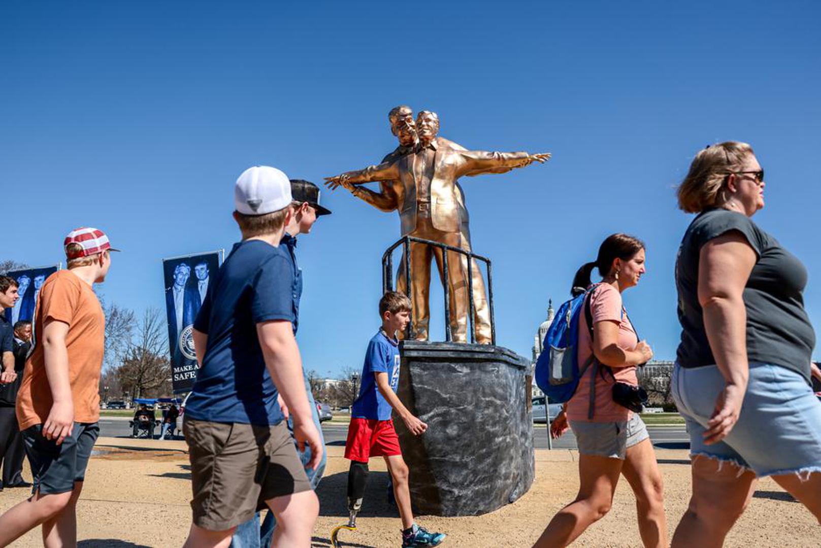 U utorak ujutro, 10. ožujka, posjetitelje i prolaznike na poznatom National Mallu u Washingtonu, nedaleko od zgrade američkog Kapitola, dočekao je nesvakidašnji prizor. Na travnjaku je osvanula gotovo četiri metra visoka, zlatnom bojom obojana skulptura nazvana "King of the World".
