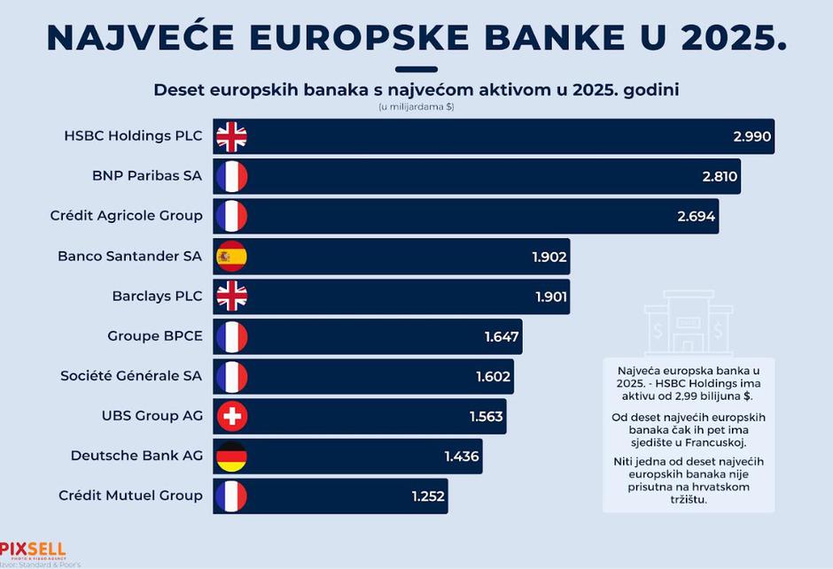 Prema podacima za 2025. godinu, najveća europska banka prema ukupnoj aktivi je HSBC Holdings PLC s gotovo 3 bilijuna dolara. Slijede ga dvije francuske banke - BNP Paribas i Crédit Agricole, čime Francuska potvrđuje vodeću ulogu u europskom bankarstvu s čak pet banaka među deset najvećih, uključujući i Groupe BPCE, Societe Generale te Credit Mutuel Group. Na popisu su i banke iz Španjolske, Ujedinjenog Kraljevstva, Švicarske i Njemačke, no ni jedna od vodećih europskih banaka nema prisutnost na hrvatskom tržištu.