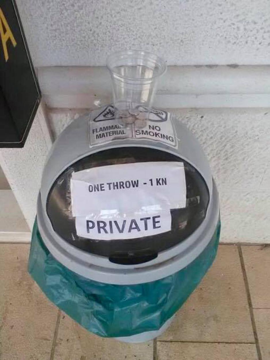 Na Facebook stranici ''Dnevna doza prosječnog Dalmatinca'' osvanula je fotografija kante za smeće na kojoj je postavljena plastična čaša za prikupljanje kovanica, a na košu piše: ''Jedno bacanje – jedna kuna''.