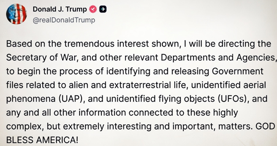 Zasad nije jasno koji bi dokumenti o NLO-ima mogli biti objavljeni niti što bi mogli sadržavati. Pentagon desetljećima prati izvješća o onome što naziva neidentificiranim zračnim fenomenima (UAP). Međutim, vojska je u izvješću iz 2024. godine navela kako nema dokaza da je ijedna vladina istraga o UAP-ovima potvrdila postojanje izvanzemaljskog života.