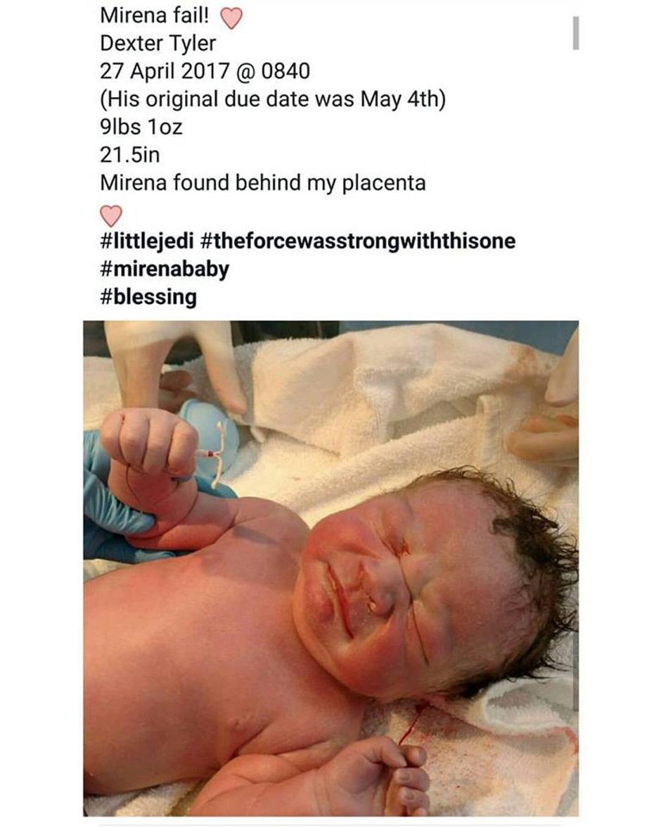Lucy Hellein iz Alabame u SAD-u šokirala se kada je vidjela da njezin tek rođeni sin u ruci drži njezinu hormonalnu spiralu koja je trebala spriječiti trudnoću. Babice su ušle u sobu, a mališan je to imao u rukama.