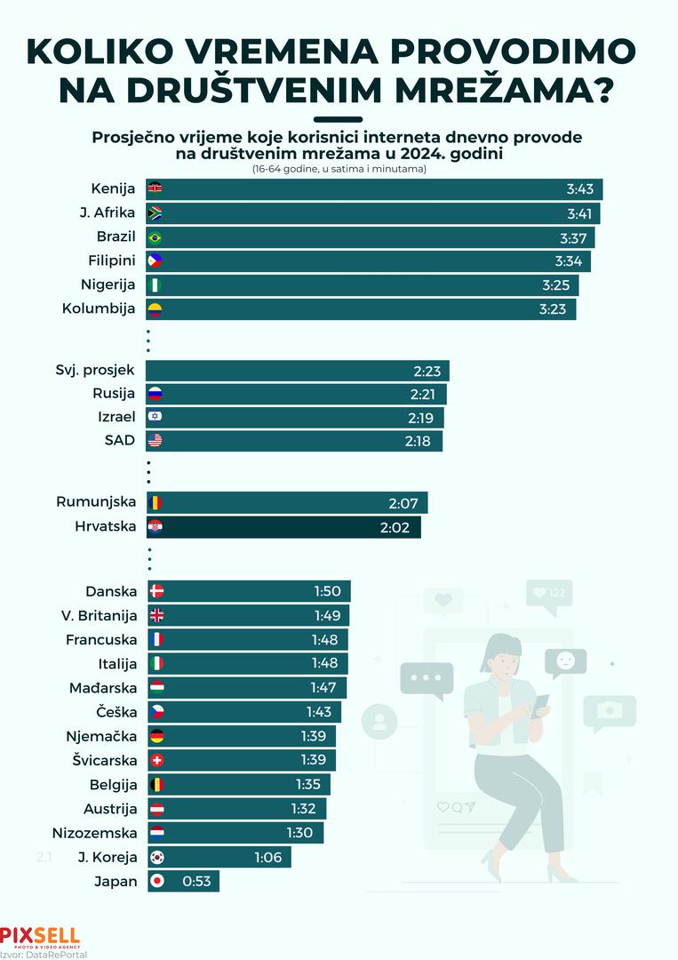 Korisnici interneta diljem svijeta znatno se razlikuju u vremenu koje provode na društvenim mrežama. Najviše vremena na njima dnevno provode stanovnici Kenije, nakon kojih slijede korisnici iz Južne Afrike i Brazila. S druge strane, susjedna Hrvatska se nalazi ispod svjetskog prosjeka, s državama poput Rusije, SAD-a i Izraela. Na dnu ljestvice su Japanci, koji provode najmanje vremena na društvenim mrežama, što je u skladu s njihovom kulturom koja često preferira drugačije oblike digitalne komunikacije.
