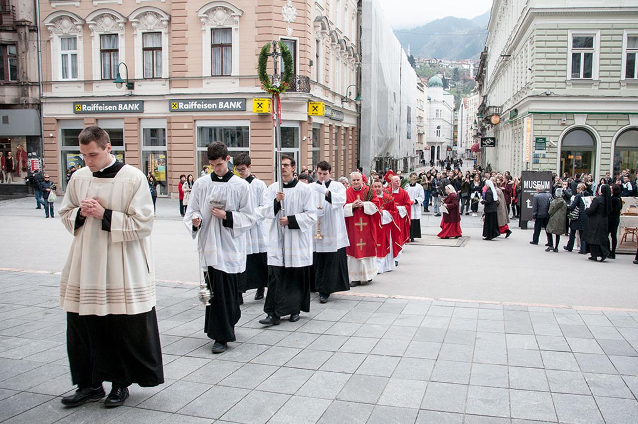 Nije imao nosne kanile za kisik, trgom se kretao u kolicima rukujući se s okupljenima i nudeći djeci slatkiše prije nego što je s oltara pred bazilikom svetog Petra poručio da svima želi "sretnu Cvjetnicu i sretan Veliki tjedan".