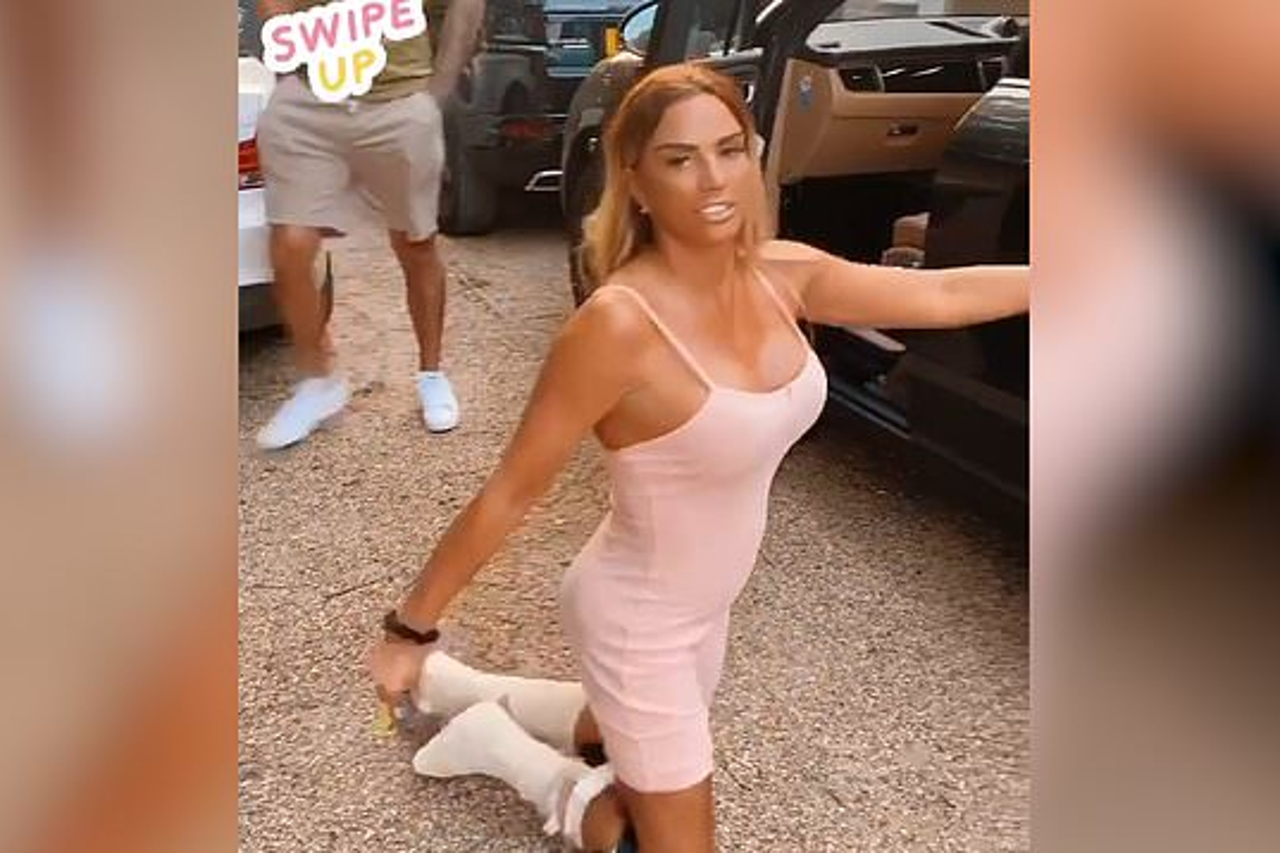 Bivši glamurozni model Katie Price slomila oba stopala, kreće se na koljenima Na koljenima je Katie imala štitnike, dok je ispod koljena na obje noge bila imobilizacija