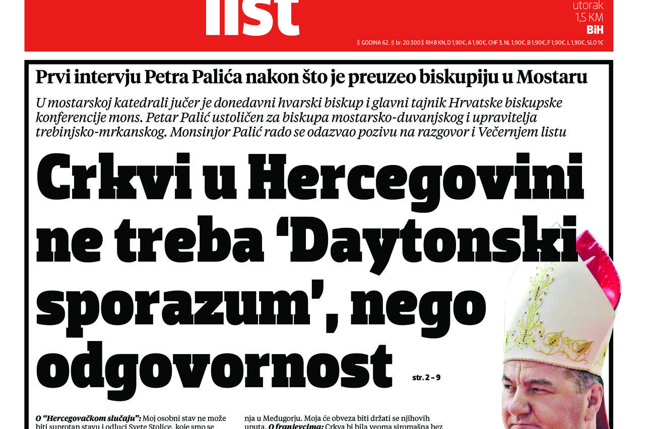večernjak, 15. rujna U Večernjem listu čitajte: Prvi intervju Petra Palića nakon što je preuzeo biskupiju u Mostar