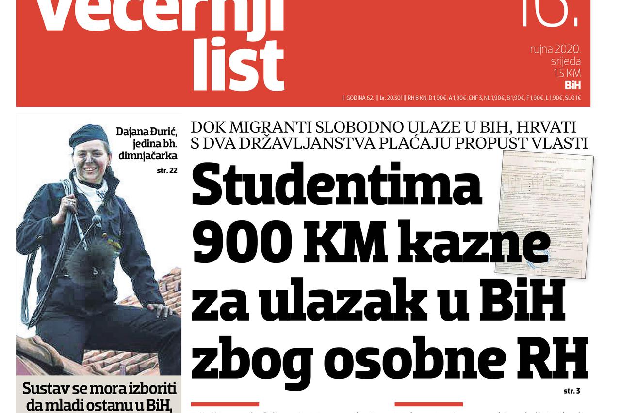 večernjak, 16. rujna U Večernjem listu čitajte: Studentima 900 KM kazne za ulazak u BiH zbog osobne RH