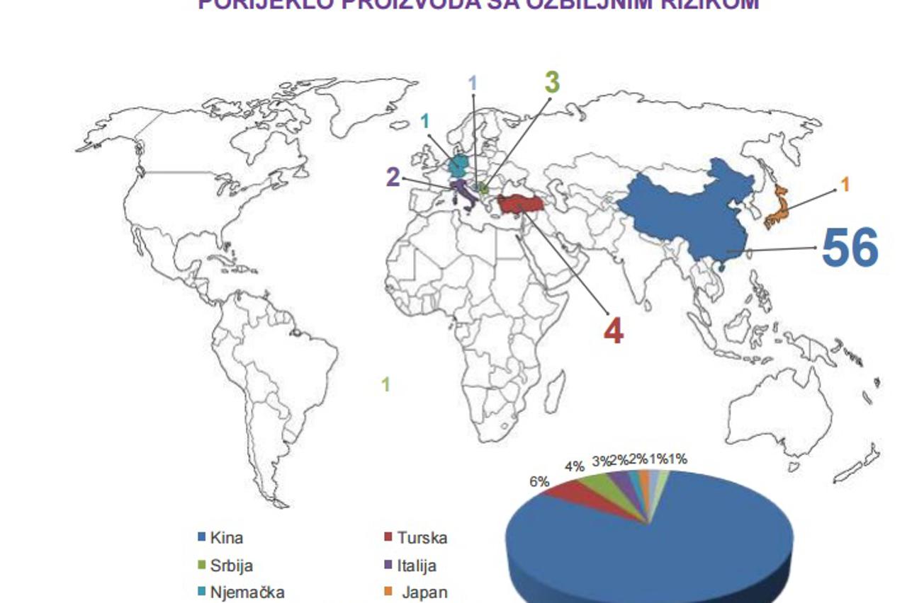 Nadzor tržišta BiH Iz Kine stižu opasne dječje igračke, kuhala, tosteri, svjetiljke, bicikli posto 81 8764 Prema podrijetlu proizvoda koji predstavljaju ozbiljan rizik, čak 81 posto odnosi se na Kinu, na Tursku 6 posto, Srbiju 4 posto, Italiju 3 posto, te Njemačka, Japan i BiH od 2 do 1 posto