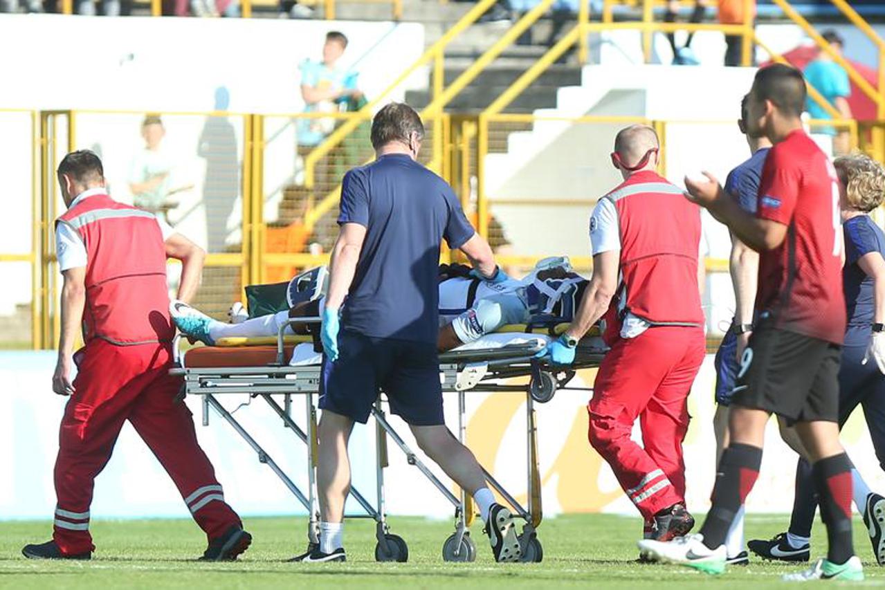 U 26. minuti, krilni igrač Engleske Tashan Oakley-Boothe doživio je ružnu ozljedu nakon duela sa Hasanom Adiguzelom