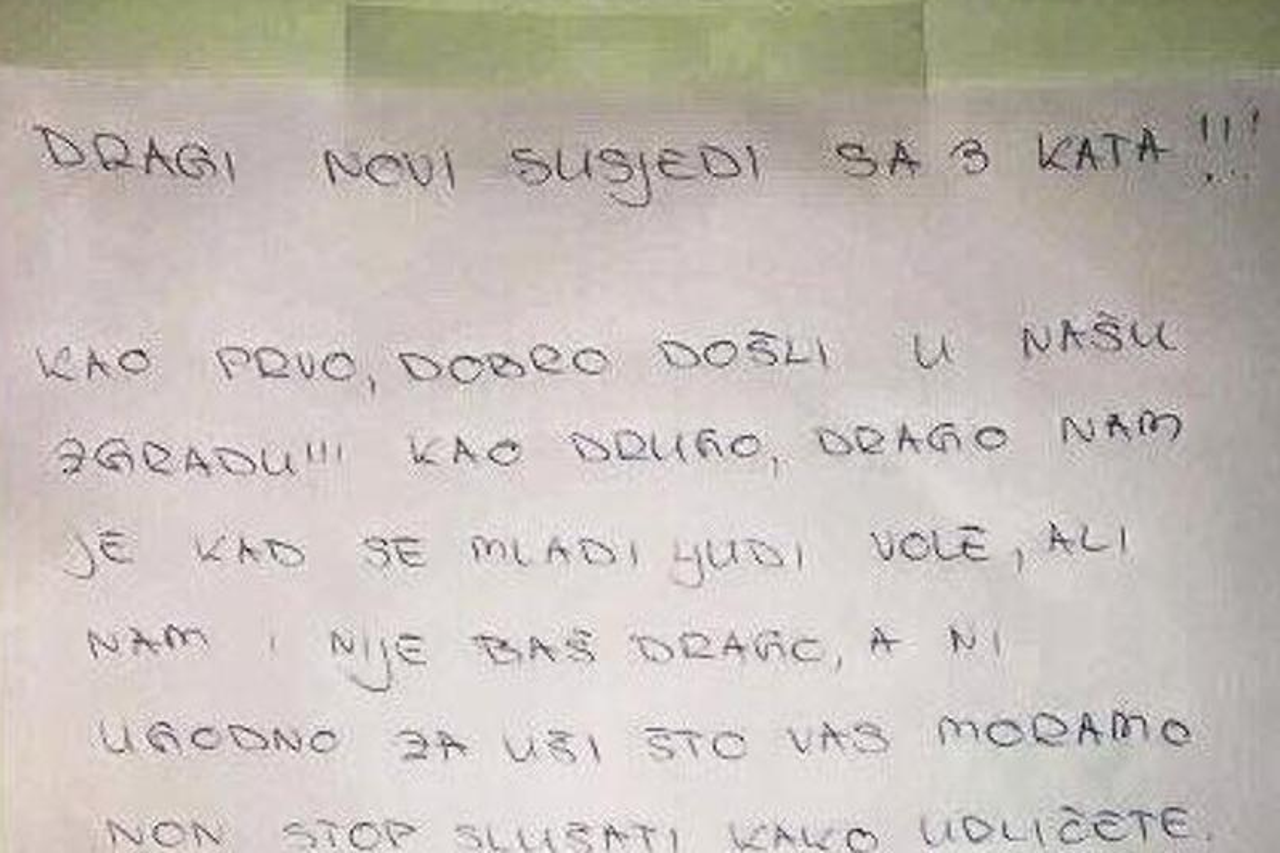 STIŠAJTE SE! Brutalna poruka novim susjedima: 'Drago nam je da se mladi ljudi vole, ali...' Na početku poruke novim susjedima je iskazana dobrodošlica u zgradu, ali potom su počele lekcije iz bontona...