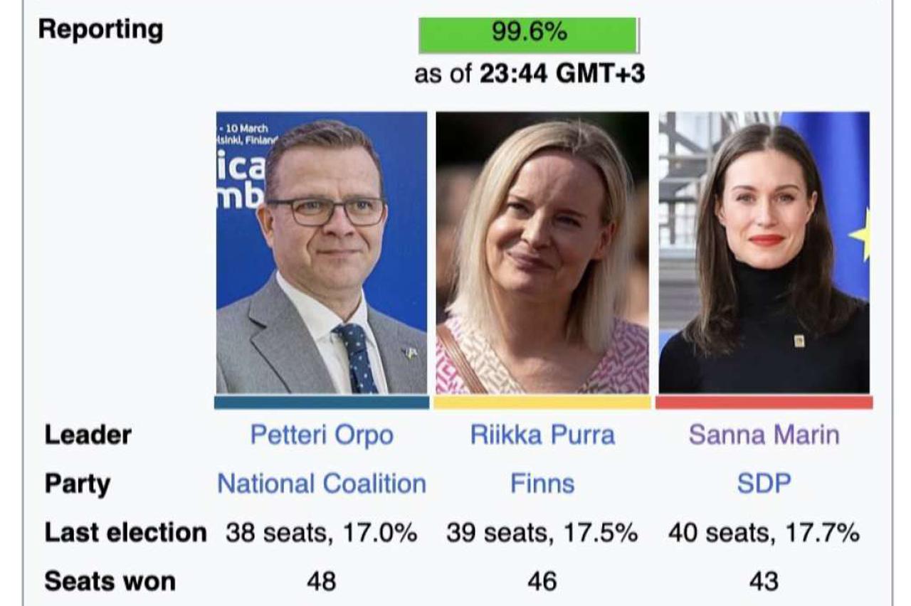 dramatična noć Sanna Marin poražena u tijesnjoj utrci na izborima u Finskoj Orpo je osvojio 20,8 posto glasova, ispred desničarske populističke Finske stranke i lijevog centra. Populisti su osvojili rekordnih 20,1 posto.