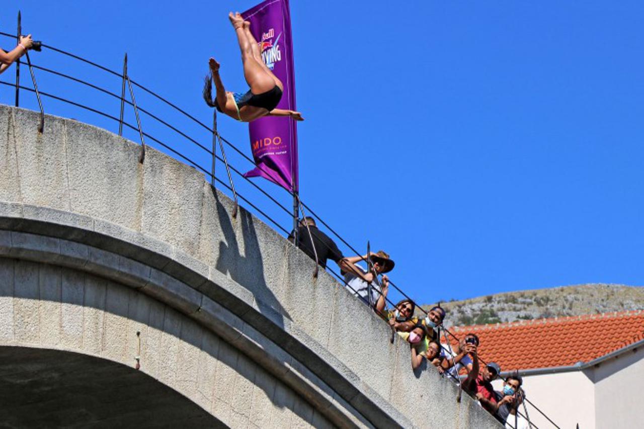 Red Bull Cliff Diving FOTO 'Crveni bikovi' poletjeli sa Starog mosta Posebnost prve serije skokova bila ja u tome što su skakači i skakačice skakali direktno s luka Starog mosta, u znak poštovanja prema mostarskoj tradiciji skokova
