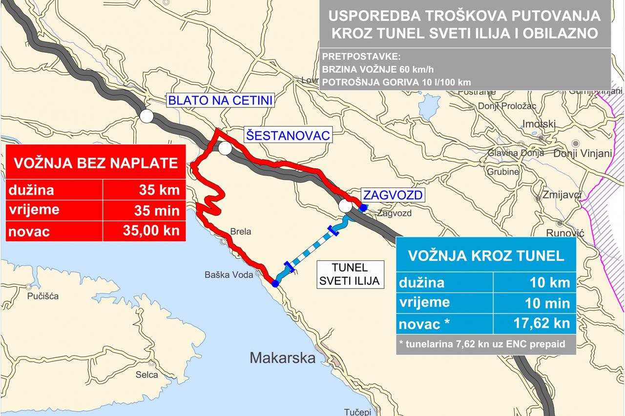 Iz HAC-a poručuju: Jeftinije je kroz Svetog Iliju i uz tunelarinu! Po računici HAC-a kroz tunel u oba smjera vozač prolazi 10 km za 10 minuta i plaća cestarinu od 17,62 kune, a vozi li se okolo proći će 35 km za 35 minuta, što će ga koštati 35 kuna.