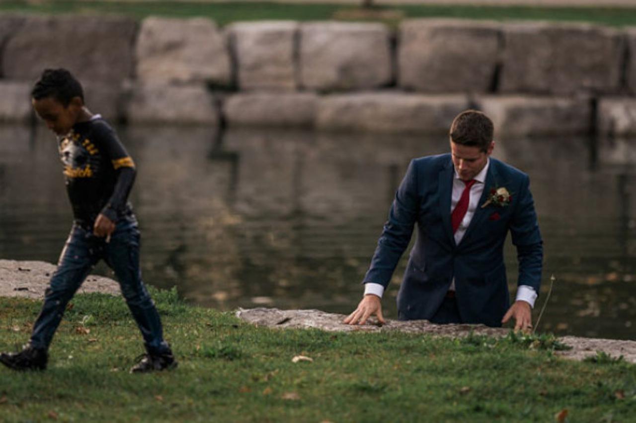 neočekivano Mladoženja skočio u rijeku Sretni mladenci pozirali su za vjenčane fotke na mostu iznad rijeke u parku kad je Clayton primijetio da je dječak upao u vodu i počeo se utapati.