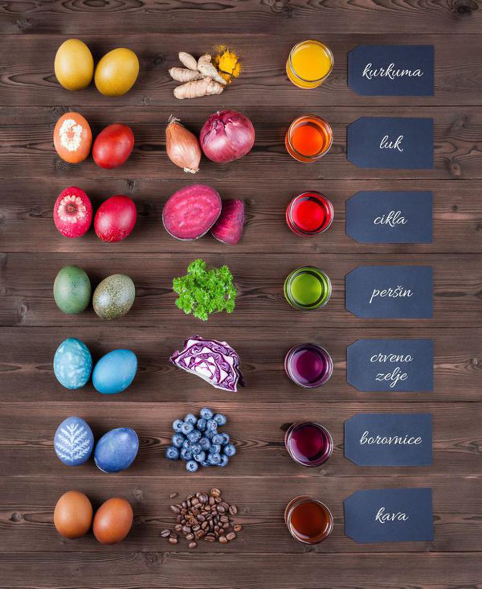 Pomiješajte jednu litru vode s dvije žlice alkoholnog octa u loncu. Dovedite tekućinu do vrenja, ubacite prirodna 'bojila' u lonac, smanjite temperaturu na najmanje, pa pustite da se lagano kuha oko pola sata. Neka se boja ohladi, a tek onda ubacite kuhana jaja u nju i pustite da odstoje.