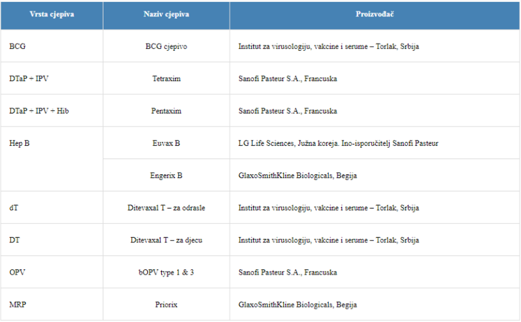 Sva cjepiva su nabavljene od proizvođača koji su pristuni na BiH tržištu više decenija i pokazali su dokazan kvalitet. Većina cjepiva, dolazi od proizvodjaca baziranih u zemljama EU, visoko razvijenih zemlja kako sto je Južna Koreja ili zemalja u okruženju, kao sto je slučaj sa BCG cjepivom koja se koristi od ranih pedestinh godina prošlog vijeka.