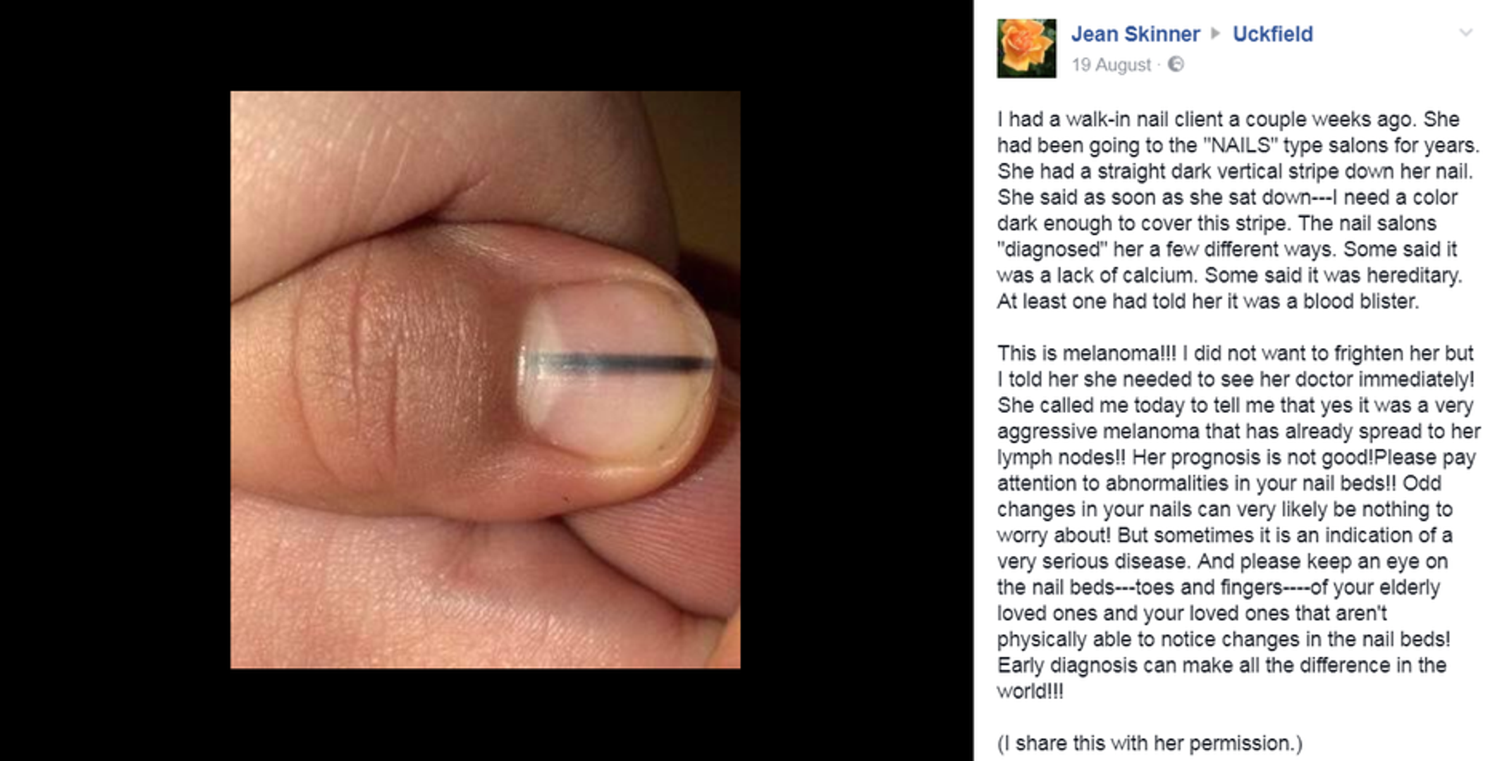 Manikerka Jean Skinner objavila je na Facebooku sliku nokta njezine klijentice koji je jasno ukazivao na probleme sa zdravljem. Jean je odmah shvatila da je ozbiljno ali nije je htjela plašiti. S dozvolom klijentice, objavila je ovaj status kako bi informirala i upozorila sve ostale da znaju, ukoliko im se pojavi takav znak, da moraju hitno otići liječniku i tražiti pregled za karcinom.
