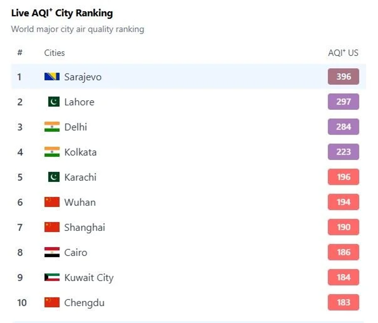Iza Sarajeva je pakistanski Lahore gdje je registriran indeks kvalitete zraka 297, dok je u indijskom Delhiju 284.