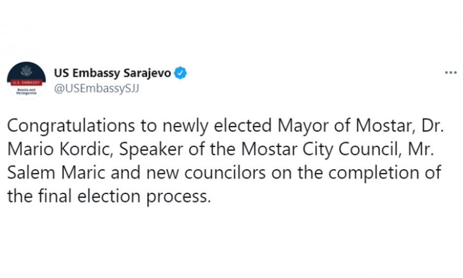 - Čestitamo novoizabranom gradonačelniku Mostara, dr. Mariju Kordiću, predsjedniku Gradskog vijeća Mostara, gospodinu Salemu Mariću i novim vijećnicima na uspješno okončanom izbornom procesu - navodi se na Twitter nalogu Ambasade SAD-a u BiH.