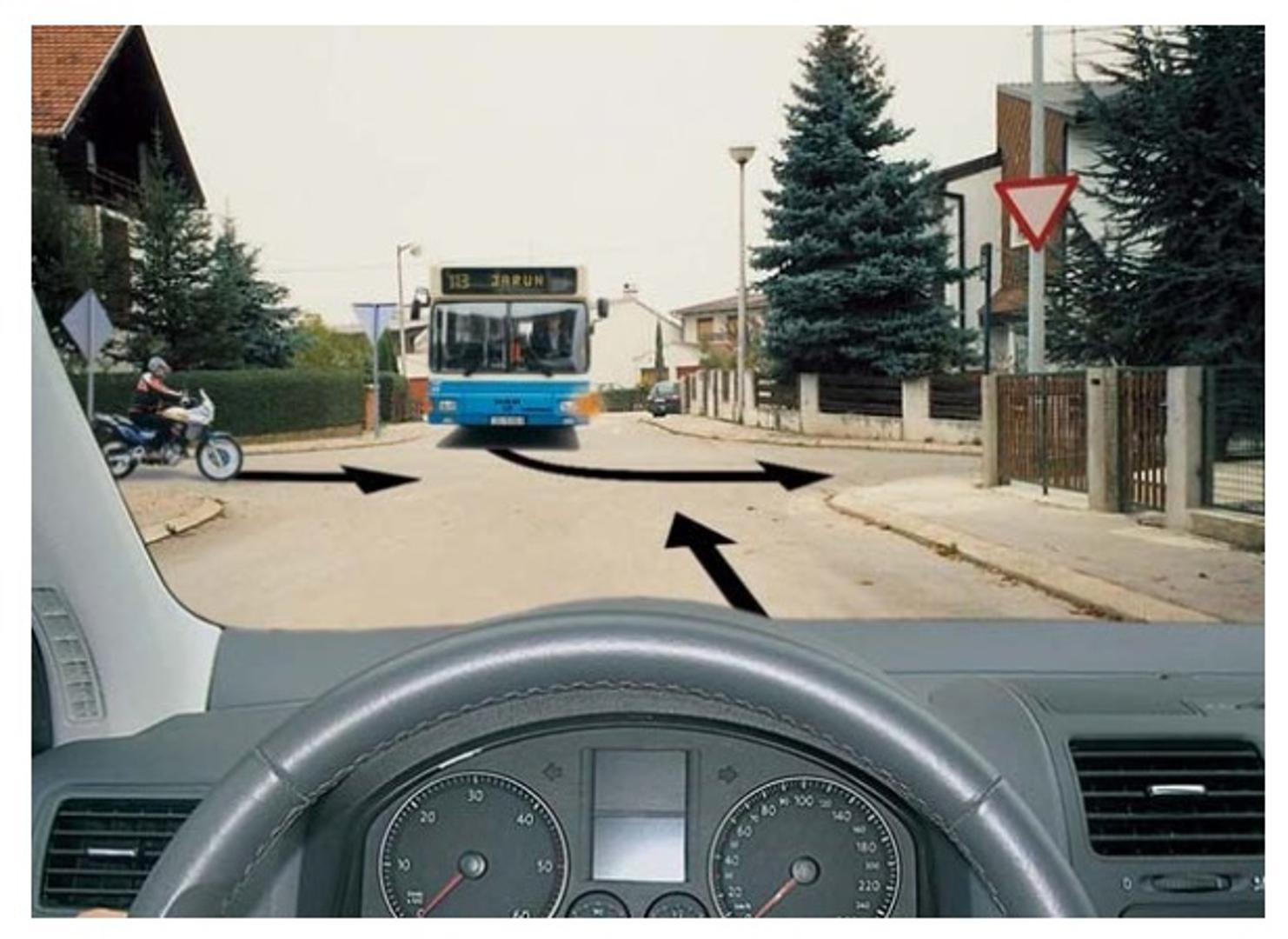 Na ilustraciji se nalaze osobni automobil, motocikl i autobus. Vozaču automobila ponuđena su tri moguća odgovora: voziti prije motocikla, voziti prije autobusa i propustiti motocikl.