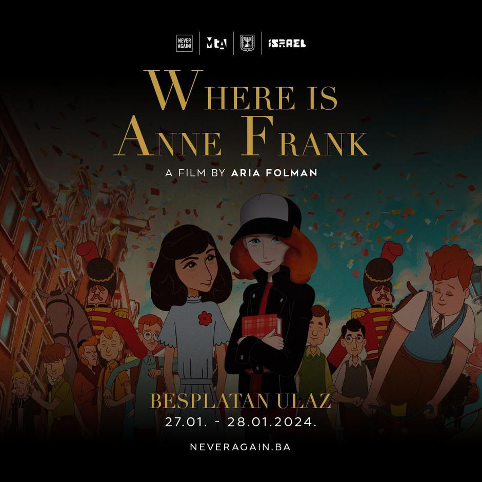 Veleposlanstvo Države Izrael i M.T. Abraham Group u povodu Međunarodnog dana sjećanja na žrtve holokaustaorganiziraju besplatne projekcije filma "Where iz Anne Frank".  Ova inicijativa ima za cilj podizanje svijesti i educiranje o jednom od najstrašnijih zločina u povijesti čovječanstva.