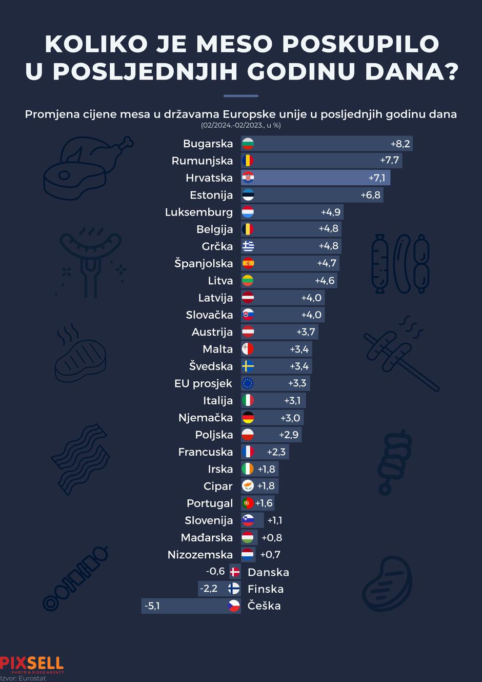 U veljači ove godine cijena je bila veća za 3,3 posto u odnosu na isti mjesec prethodne godine. Prema podacima Eurostata, svinjsko meso najviše je poskupjelo, za 5,7 posto, u odnosu na janjeće i kozje, koje je "skočilo" za 4,5 posto. Goveđe i teleće meso skuplje je za 3 posto, dok je meso peradi zabilježilo pad od 1,6 posto u odnosu na veljaču 2023. Tijekom protekle tri godine godišnje stope inflacije za meso bile su najveće između travnja 2022. i ožujka 2023. godine, s godišnjim stopama promjene iznad 10 posto. Najviša stopa zabilježena je u veljači 2023. godine, kada je cijena bila viša za 17,3 posto u odnosu na veljaču 2022. godine. Godišnji rast cijena junećeg, telećeg, janjećeg i kozjeg mesa ostao je ispod 15 posto u protekle tri godine, dok su cijene peradi (+24,4% u studenome 2022.) i svinjskog mesa (+18,8% u veljači 2023.) zabilježile veće oscilacije. Kada je riječ pojedinačno o zemljama Europske unije, cijene mesa su u posljednjih godinu dana najviše porasle u Bugarskoj, i to za 8,2 posto, zatim Rumunjskoj za 7,7 posto te Hrvatskoj za 7,1 posto. U Njemačkoj su cijene mesa više za 3 posto, Sloveniji 1,1 posto, Italiji 3,1 posto.